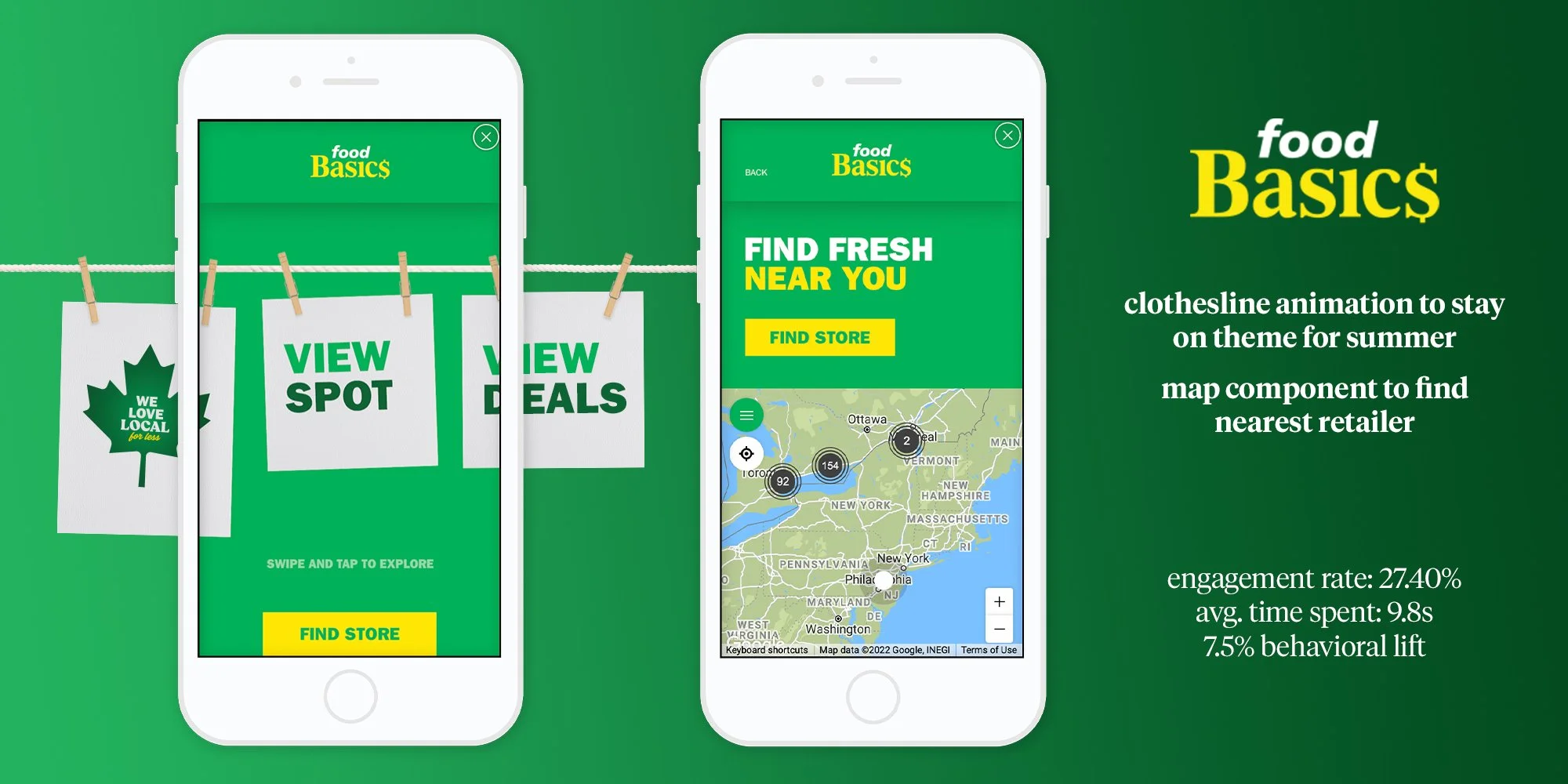 Using custom campaign assets alluding to local, summer parties, this unit begins with a quick animation of a clothesline of signs rolling into the screen, prompting the user to “view spot” or “view deals,” where they can watch a video about the summer campaign or view in-store sales. On the bottom sits a button to “find stores,” where they can use a Google map component to find their closest retailer.